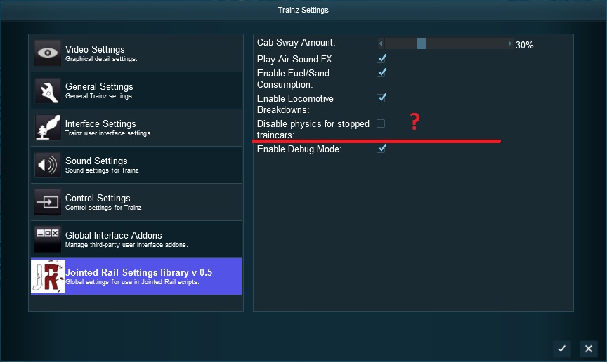 | Lexys25, надо было сразу написать сюда о глюке! Я нашёл ошибку и исправил (можно забрать обновление в первом сообщении). Насчёт выкатывающихся вагонов - ещё раз прогнал сценарий - "грузовой из Крыма" - не катятся! Вот скрин моих настроек, но не думаю, что в них дело...