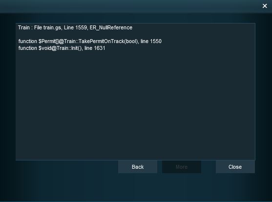 | Цитата Добрый (  ) su-de, все ошибки на скринах - в файле train.gs, это один из встроенных скриптов (resources/scripts). Ошибка возникает, когда этот скрипт начинает обрабатывать какой-то из вагонов, имеющих ошибку (или когда Трайнз считает, что ошибка есть). Например, на четвёртом скрине, ошибка возникла при получении от сценария команды поставить вагон на тормоза. Думаю, понятно, что это команда дефолтная, часто повторяется в скрипте сценария и не может вызвать ошибку только в одном месте, разве что эту команду получил объект, у которого нет тормозов. И что же делать? Или с чем это едят? Ведь тот же состав 310 Симферополь-Одесса идёт без проблем с тем же сосатвом! Как это понимать? И полностью согласен с Lexys25, крутой маршрут! Я также увлекаюсь Train Simulator (Railworks), но там даже близко ничего подобного нет! Вам надо запантетовать ваш особый стиль, а то эти проклятые буржуи быстро это оприходуют, и будут выдавать за своё, я знаю о чём говорю!