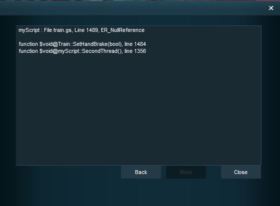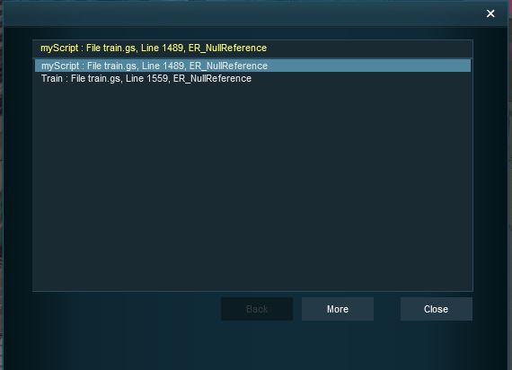 | su-de, все ошибки на скринах - в файле train.gs, это один из встроенных скриптов (resources/scripts). Ошибка возникает, когда этот скрипт начинает обрабатывать какой-то из вагонов, имеющих ошибку (или когда Трайнз считает, что ошибка есть). Например, на четвёртом скрине, ошибка возникла при получении от сценария команды поставить вагон на тормоза. Думаю, понятно, что это команда дефолтная, часто повторяется в скрипте сценария и не может вызвать ошибку только в одном месте, разве что эту команду получил объект, у которого нет тормозов.